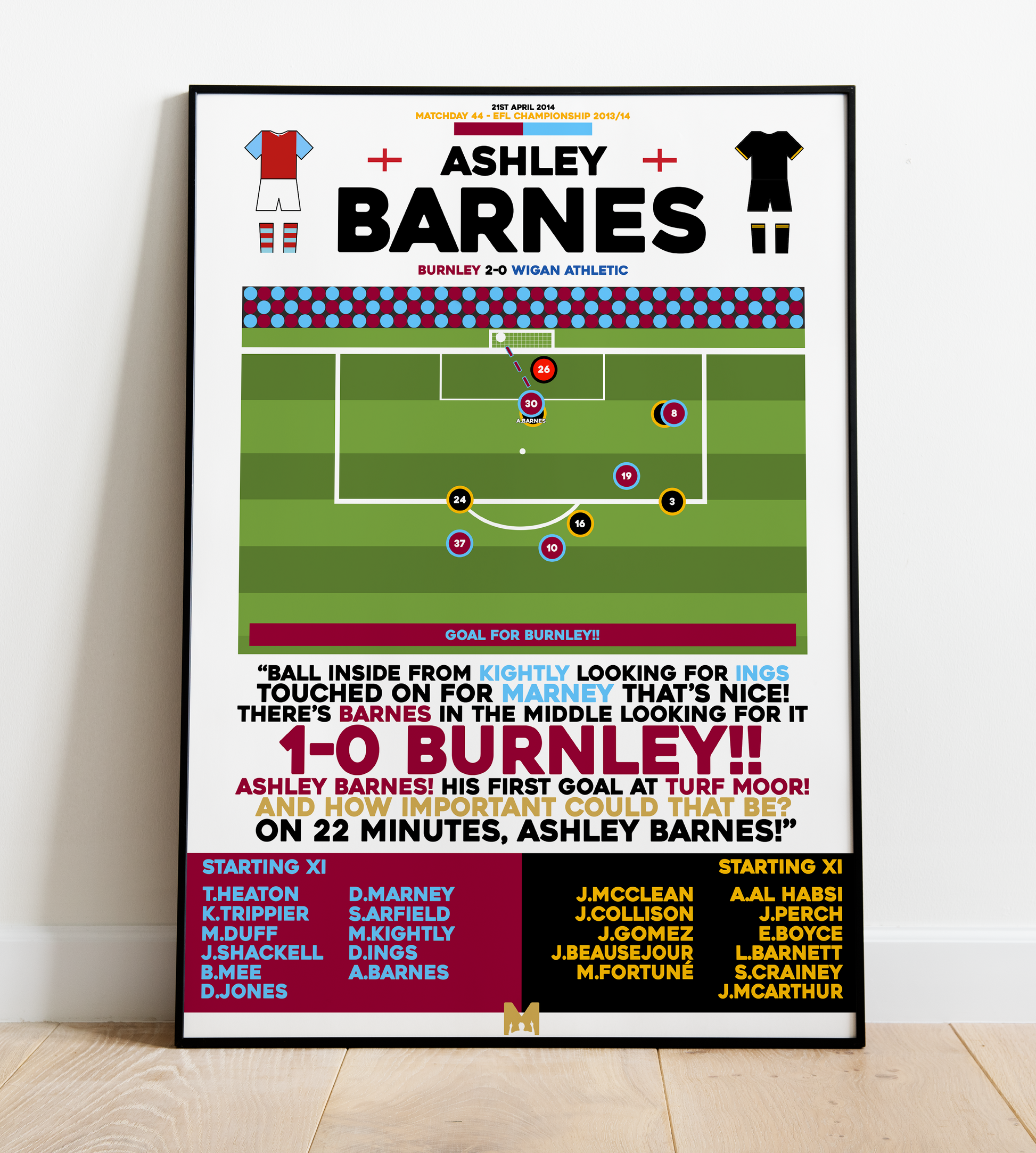 Capture Forever Ashley Barnes iconic goal vs Wigan Athletic in the 2013/14 Championship Promotion Campaign, a legendary moment in Burnley folklore.