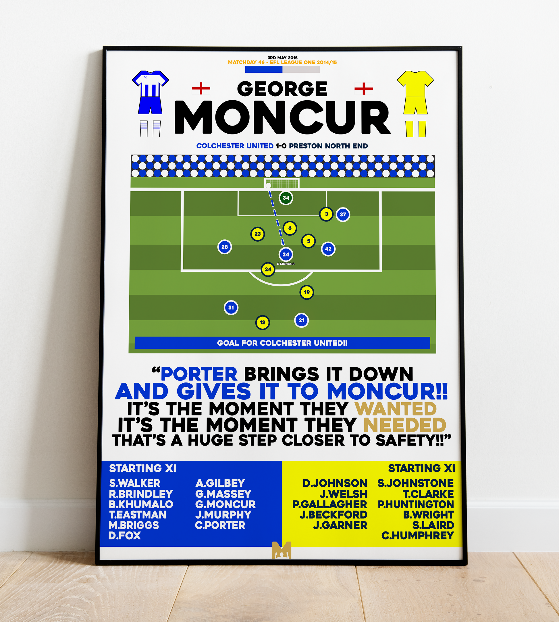 Capture Forever George Moncur's Goal vs Preston North End in the 2014/15 EFL League One Campaign, an iconic moment in Colchester United history.