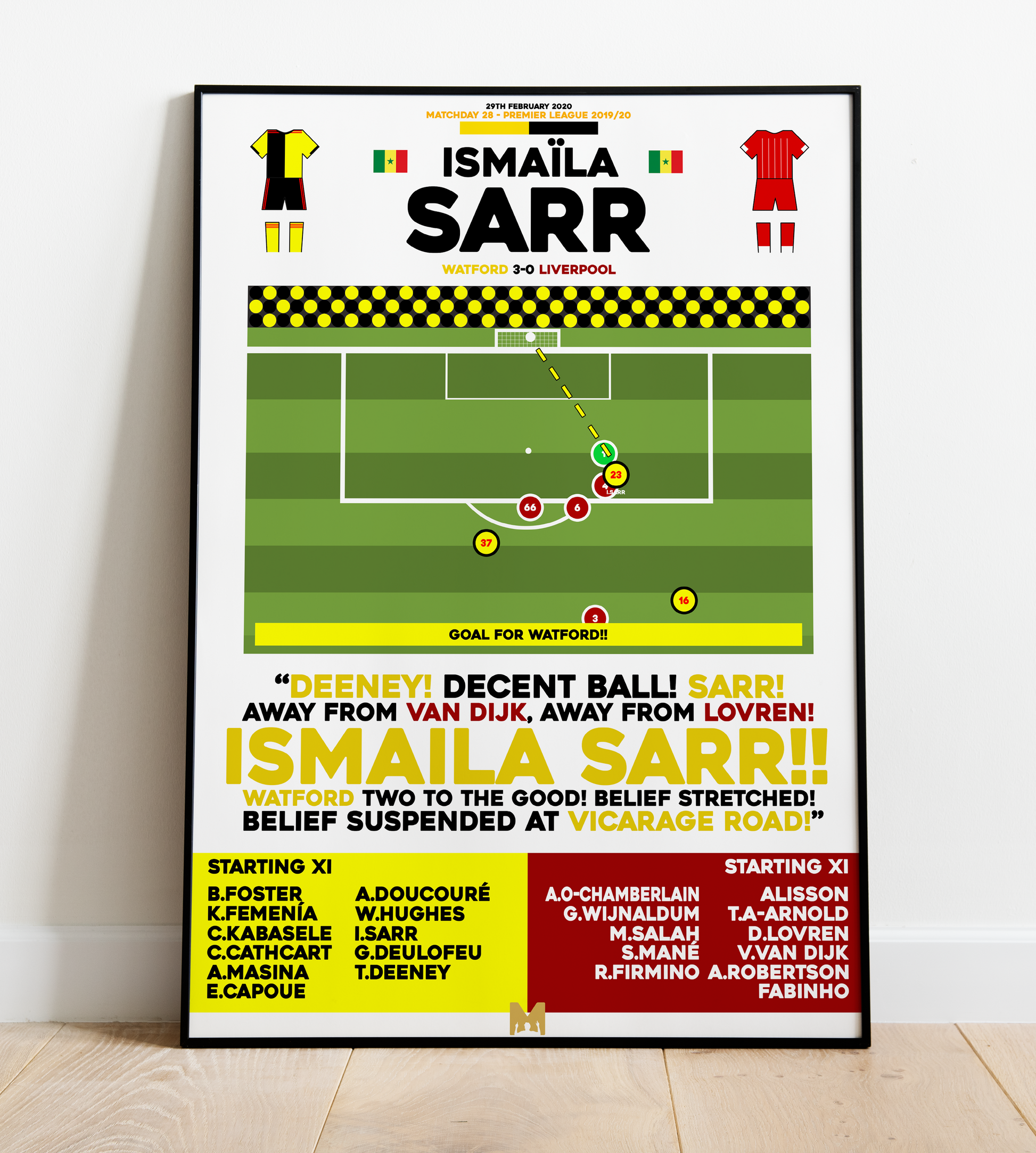 Capture Forever Ismaila Sarr's iconic goal vs Liverpool in the 2019/20 Premier League Campaign, a legendary moment in Watford folklore.