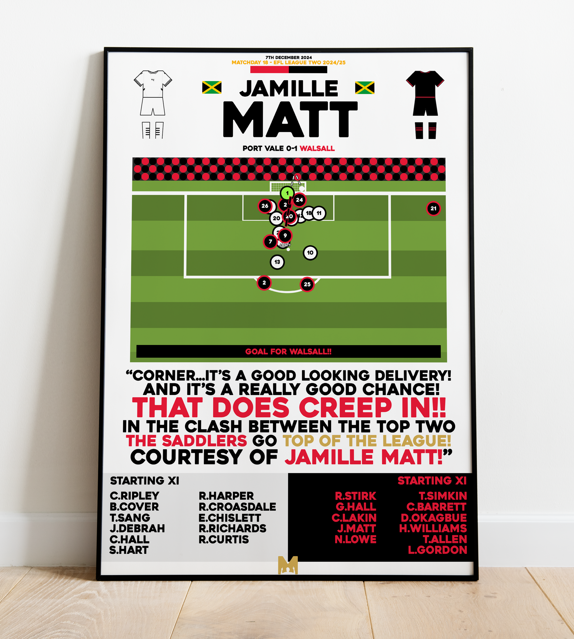 Capture Forever Jamille Matt's goal vs Port Vale in the 2024/25 League Two Campaign, an iconic moment in Walsall folklore.