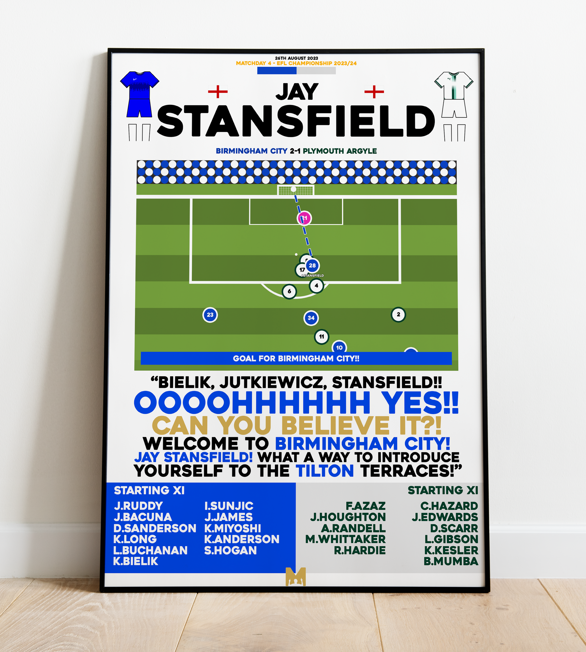 Capture Forever Jay Stansfield goal vs Plymouth Argyle in the 2023/24 EFL Championship Campaign, an iconic moment in Birmingham City's folklore.