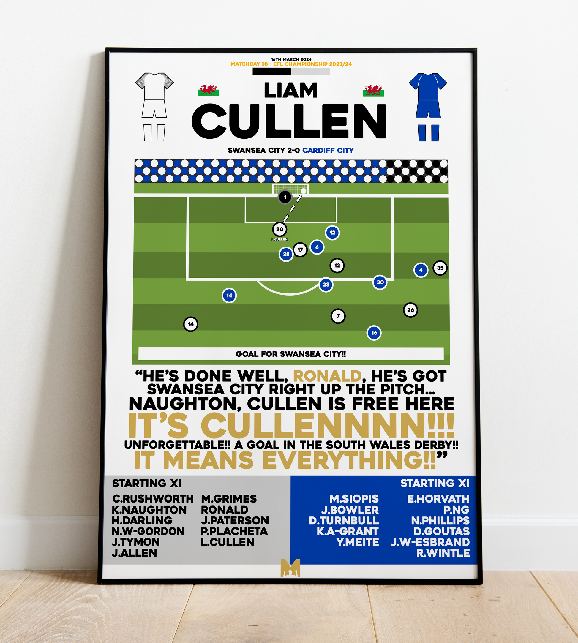 Capture Forever Liam Cullen's goal vs Cardiff City in the 2023/24 Championship campaign, a legendary moment in Swansea City folklore.