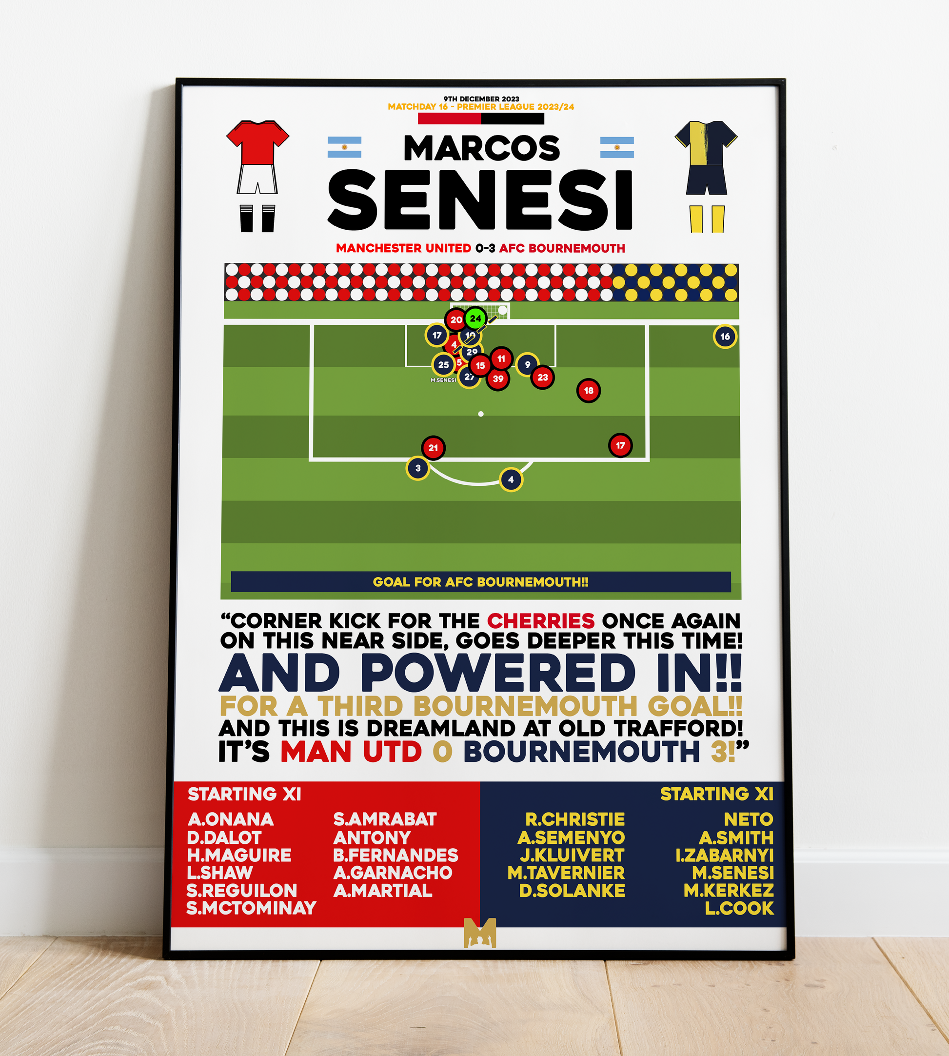 Capture Forever Marcos Senesi's iconic goal vs Manchester United in the 2023/24 Premier League Campaign, a legendary moment in AFC Bournemouth history.