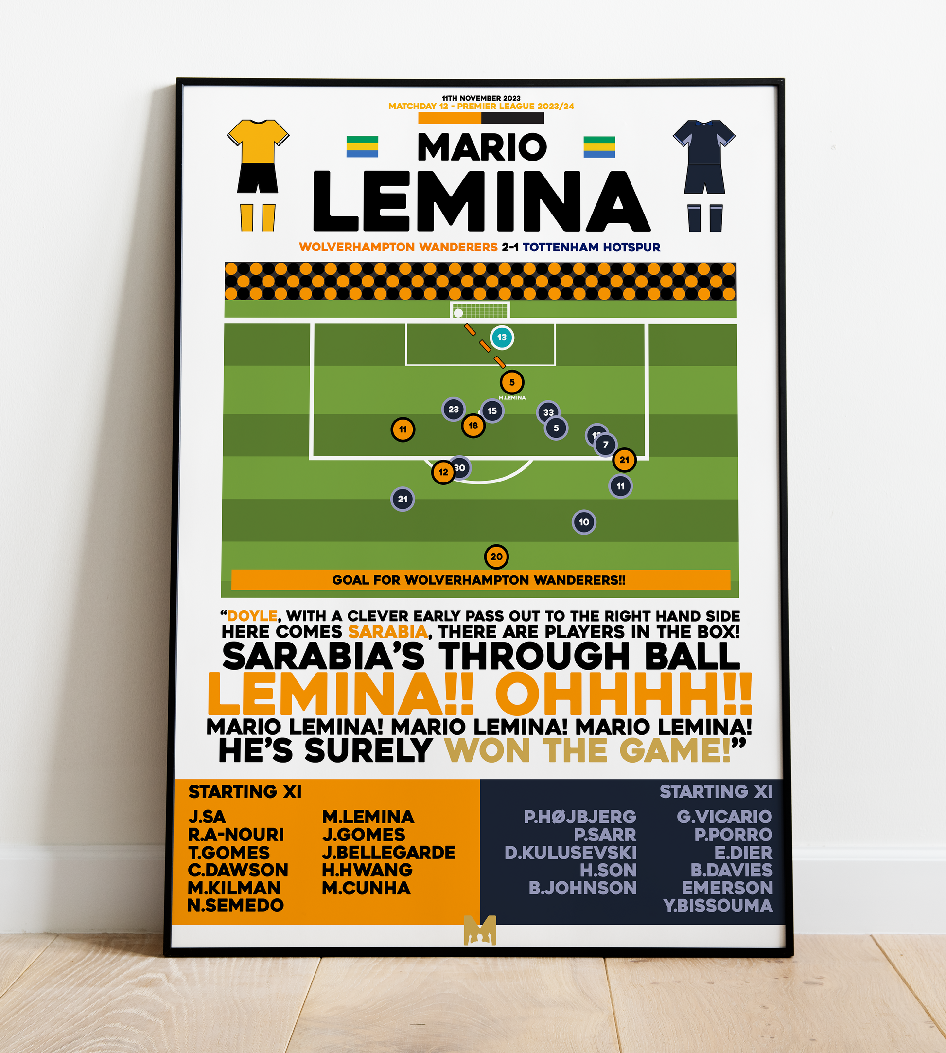 Capture Forever Mario Lemina's Goal vs Tottenham Hotspur for in the 2023/24 Premier League Campaign, an iconic moment in Wolves folklore.