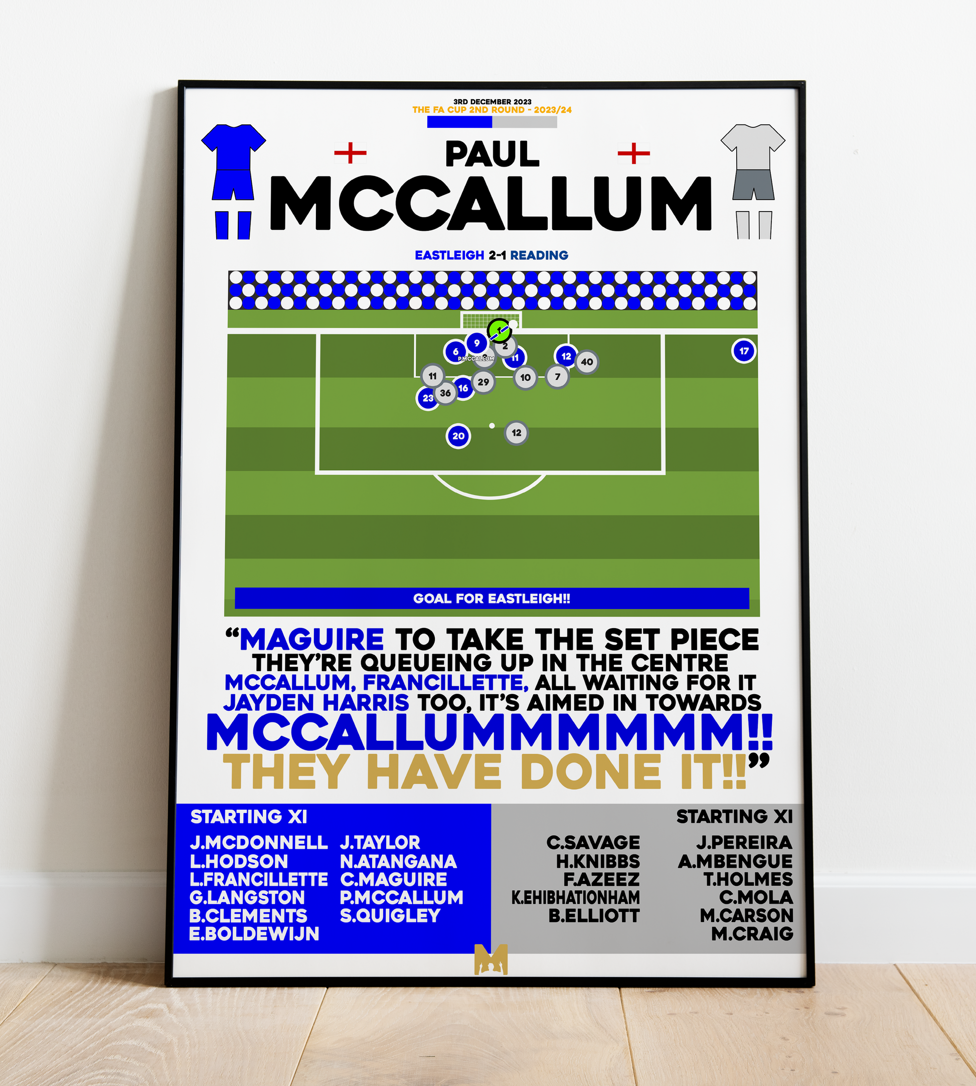 Capture Forever Paul McCallum's iconic goal vs Reading in the 2023/24 FA Cup Campaign, a legendary moment in Eastleigh folklore.