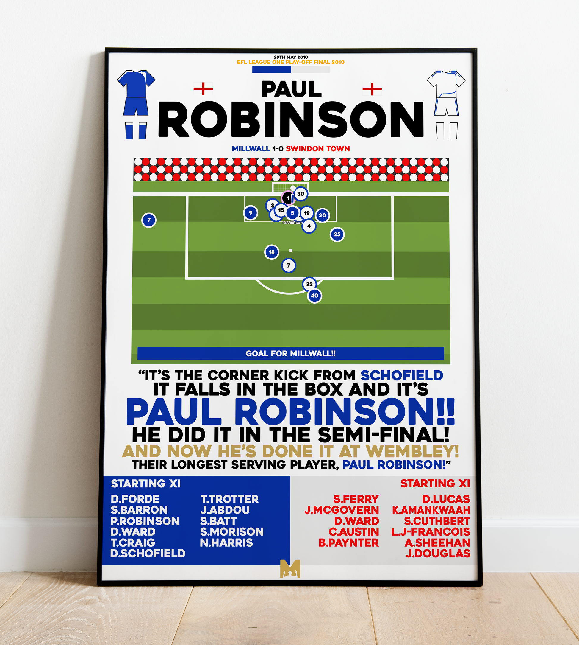 Capture Forever Paul Robinson's iconic goal vs Swindon Town in the 2012 League One Play-Off Final, a legendary moment in Millwall folklore.