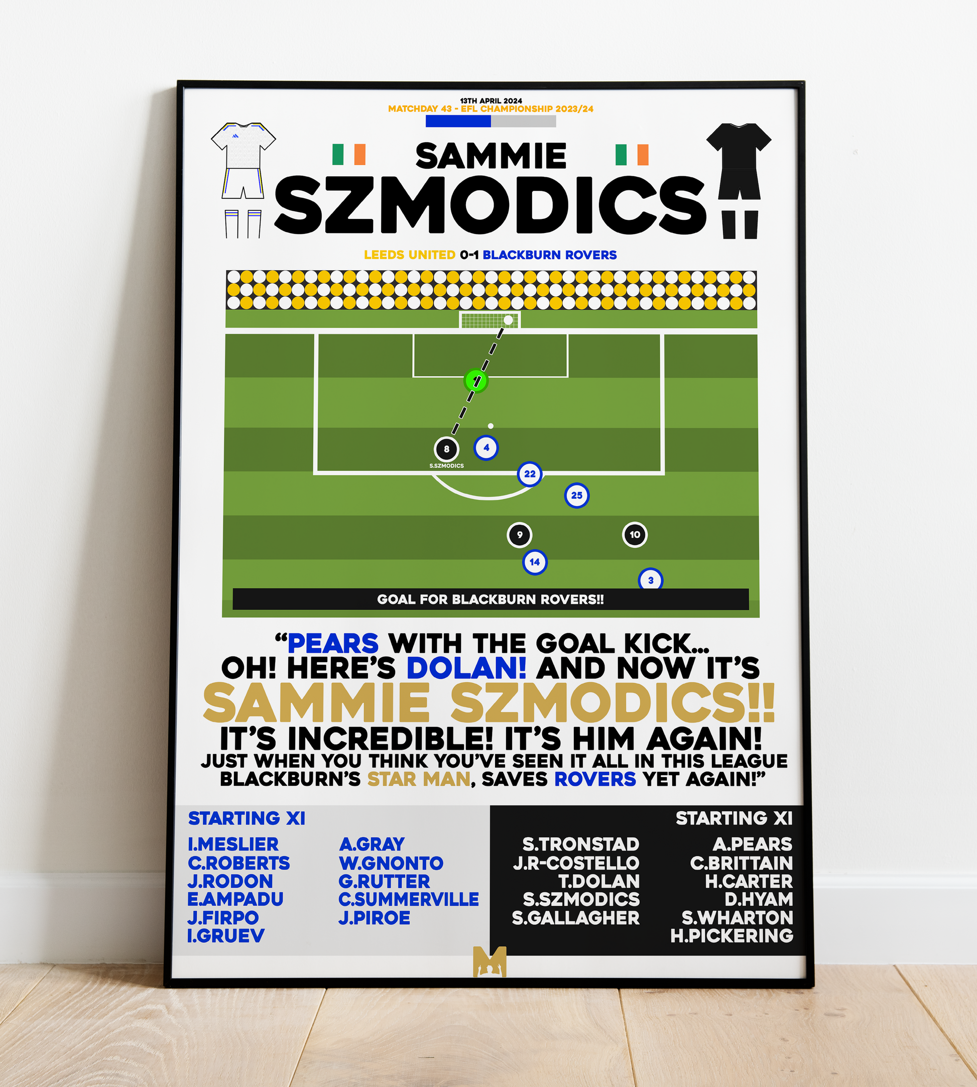 Capture Forever Sammie Szmodics goal v Leeds United in the 2023/24 EFL Championship Campaign, an iconic moment in Blackburn Rovers folklore.