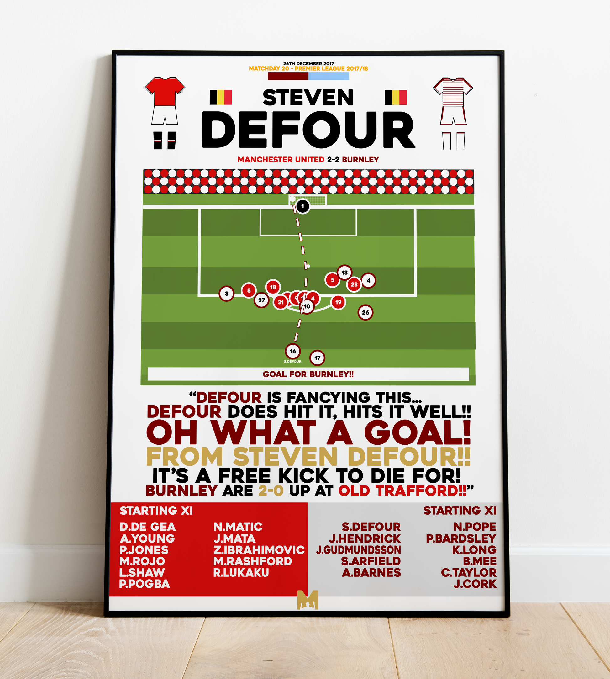 Capture Forever Steven Defour goal vs Manchester United in the 2017/18 Premier League Campaign, an iconic moment in Burnley folklore.