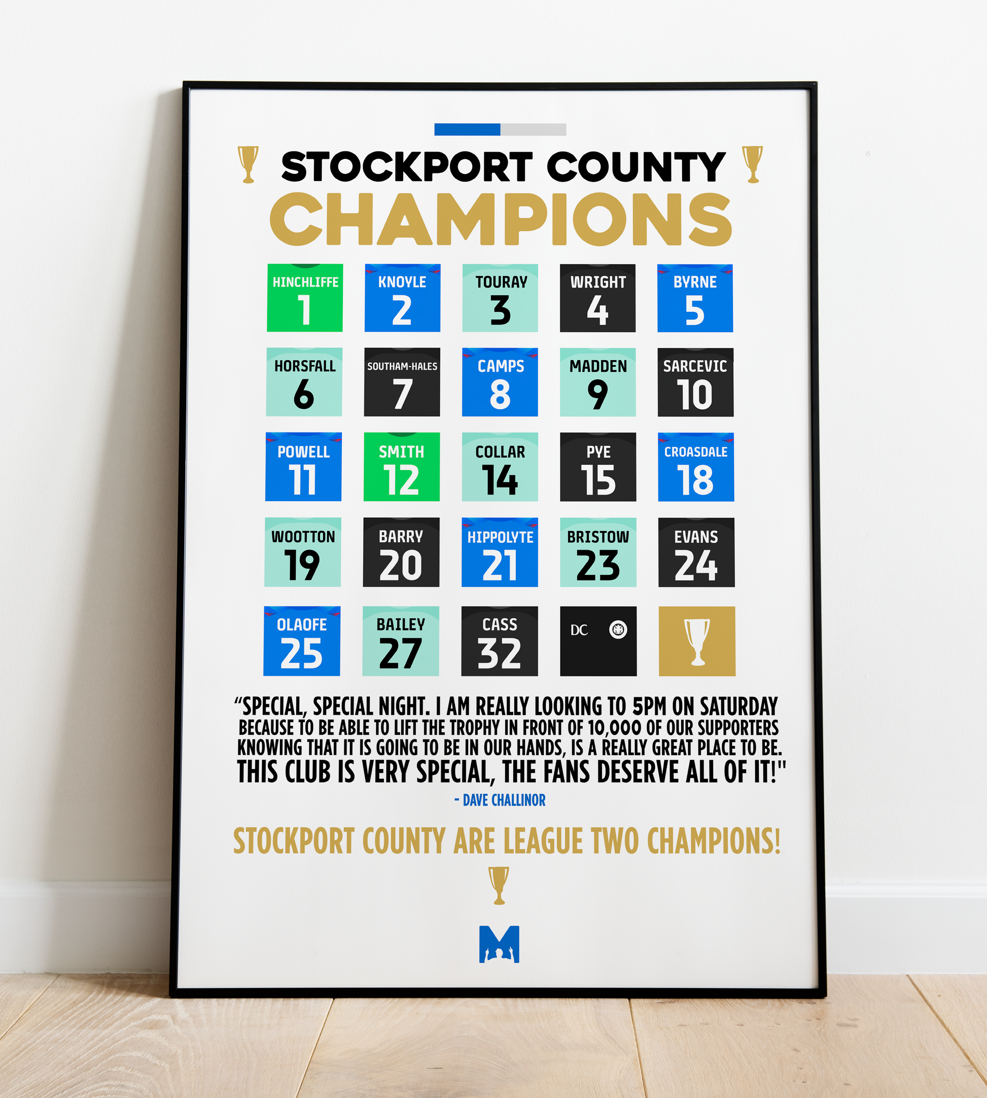 Capture forever the 2023/24 EFL League Two Title Winning Squad, a legendary season in Stockport County's history.