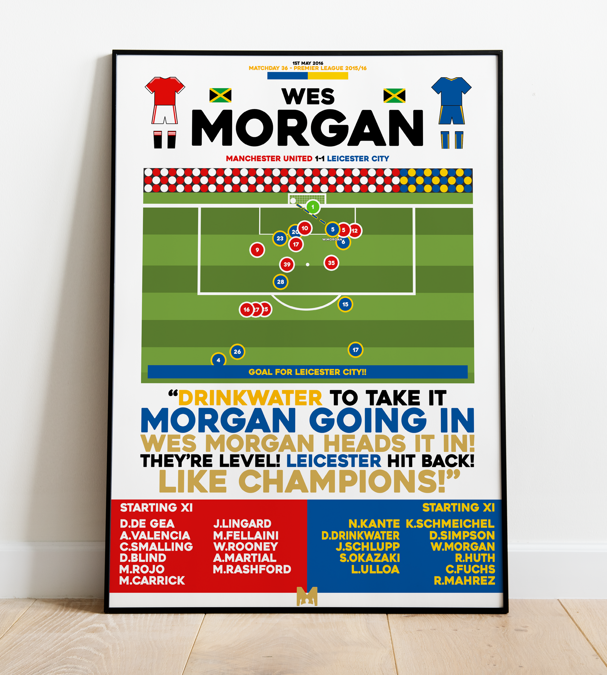Capture Forever Wes Morgan's Iconic goal vs Manchester United in the 2015/16 Title Winning Season, a legendary moment in Premier League history.